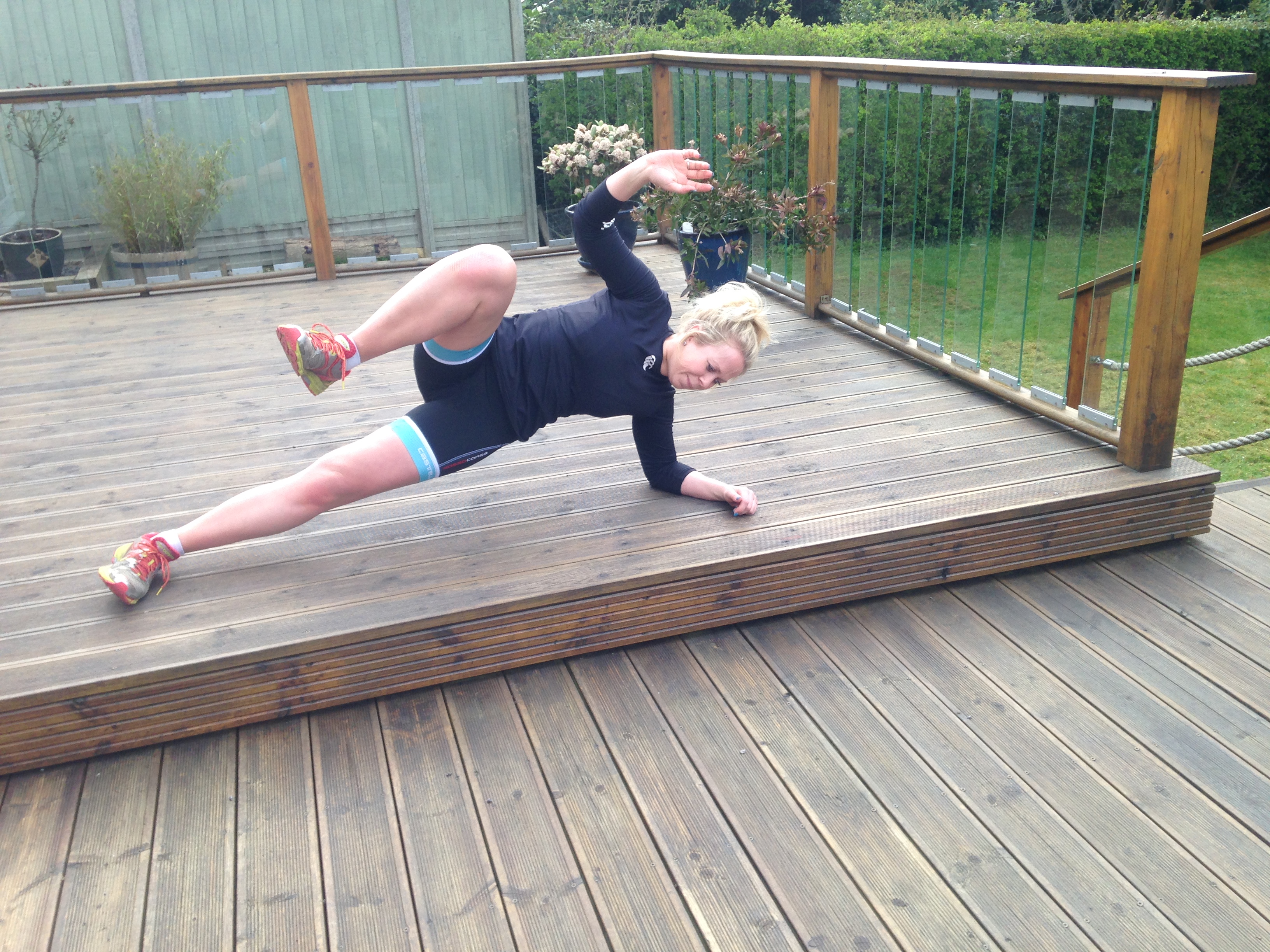 Overall, I’d say it’s a great quick and SWEATY blast that works well as a circuit base. Ideally I’d say team up with a friend and just bash through it- unless you are someone who is 100% honest and won’t cheat on the burpees when there is no-one there to tell you off… Right, so now I am going to try and actually demo them. As per usual, I’ll give a disclaimer that I am not a qualified PT, my form may not *always* be spot on and I’d definitely advise going to visit Julia’s descriptions of the activities for further detail. I’d also advise following her on Twitter @Julia_B for quick and easy workout advice when you need a bit of inspiration (i.e. often me). We also didn’t receive anything for writing this, just in case you’re wondering. I enlisted the support of some trusted helpers, hopped out to the deck and got going!