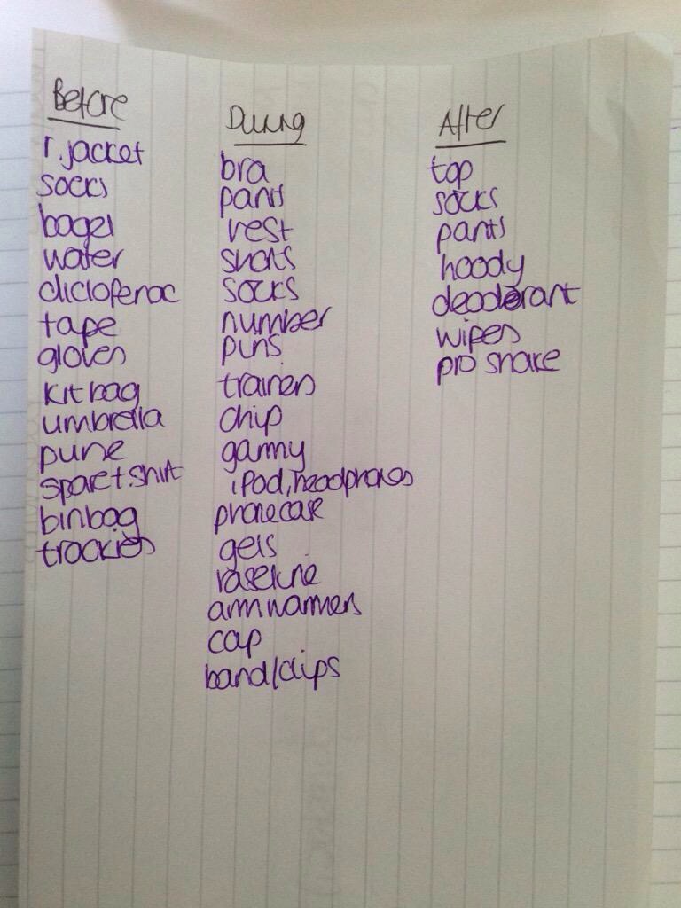 I’ve had a couple of decent shorter races recently where I’ve really surprised myself with my grit but it’s a completely different ball game. I’m ambivalent about the weather – I’ve done a couple of my long runs in fairly grim weather (and hungover but that’s another matter) What I am worried about however is the hanging around beforehand in the rain. Bleurgh. Binbags it is. But apparently now it might not rain so WHO KNOWS?!
