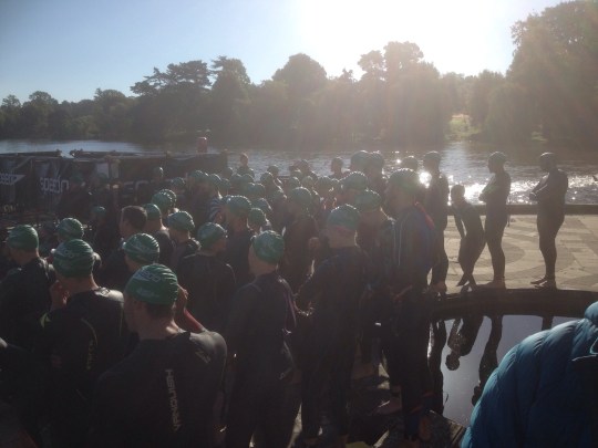 However, the queues for the car parks were INSANE. Due to the recent rain, they were, let’s say, a little soggy, meaning that chaos was caused with stuck cars, sliding cars, stressed triathletes etcetera etcetera. To be fair, Castle Triathlon did a good job of delaying waves, as well as sending mass texts to do so, but this was an additional panic I did NOT NEED. We did an emergency ‘put bike together in middle of road’ and I cycled down to registration, leaving my mum and Diana bringing my stuff and my dad in charge of the car. Got into transition, chucked my stuff around, half put my wetsuit on, didn’t really pay attention to where I was racked because I was stressed about time (more on this later), found out that the water was apparently quite cold….hot footed it down to the swim start for a little Chaser wave. We all had matching green hats. Very fetching.