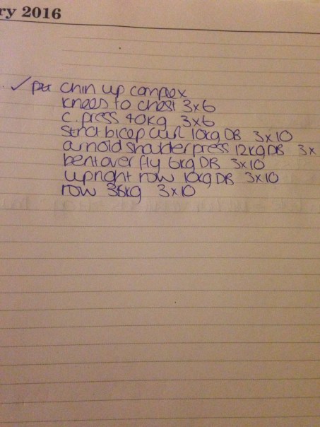 Then I went to the gym in the evening. It was full of resolutioners. But luckily 90% of them were on the cardio machines so it didn’t cause toooo much disruption. If you can read my writing, here is what I did.