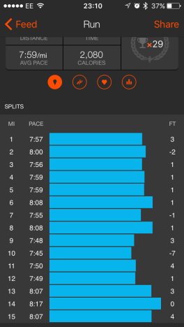 Sunday. Well this was a bundle of fun. Did I do what the plan said? No. Did I decide to just run the whole thing at 8.30s? Yes. Did I actually do this? No. Went out just under 8s, turn around around 7.5 miles, came back with 4 miles sub 7.50. OW. Then the wheels fell off a bit and 12.5-15 were a bit dreary. Let the others run on.